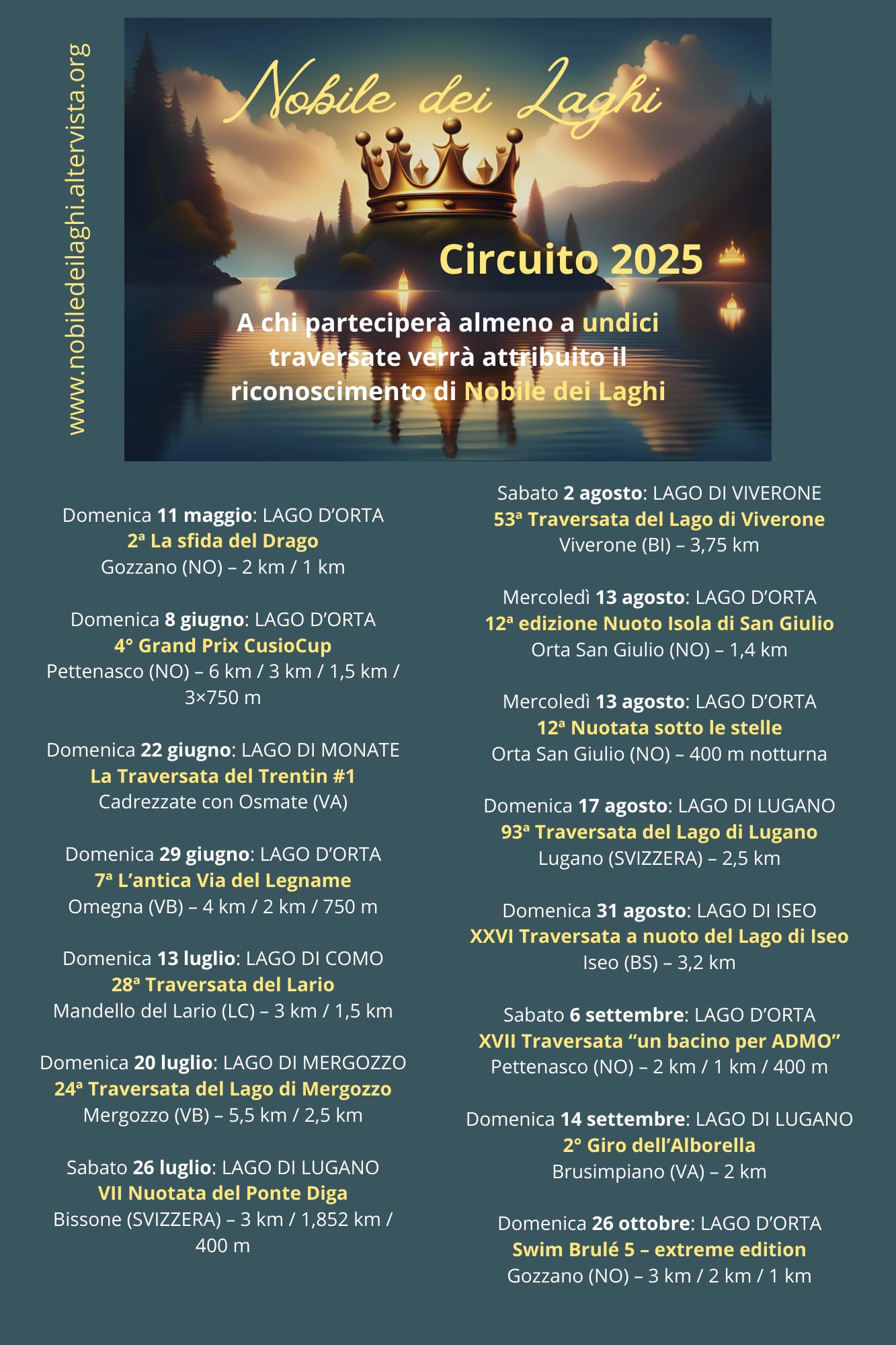 “Nobile dei Laghi” è, dal 2006, un circuito di traversate a nuoto, il cui principio fondamentale è l’aspetto amatoriale.